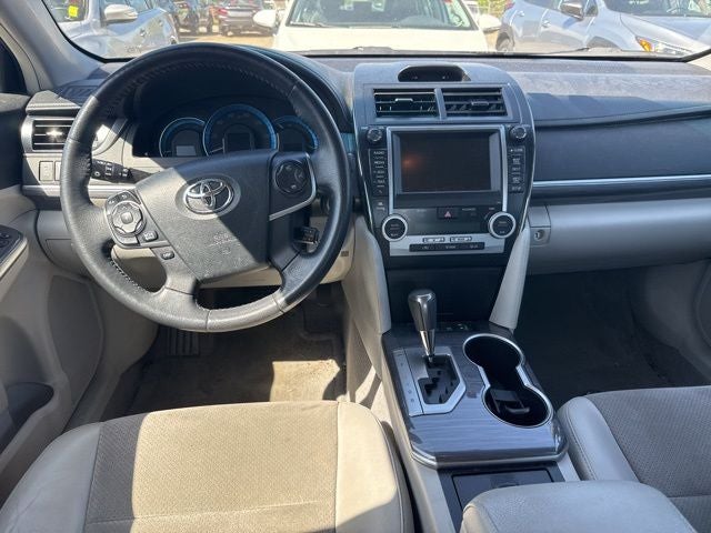 This 2013 Toyota Camry Hybrid XLE FWD is well equipped and includes these features and benefits: 2.5L I4 Hybrid DOHC, 4-Wheel Disc Brakes, 6 Speakers, 7.0J x 17 Alloy Wheels, ABS brakes, Air Conditioning, Alloy wheels, AM/FM radio, Auto-dimming Rear-View mirror, Automatic temperature control, Brake assist, Bumpers: body-color, CD player, Compass, Delay-off headlights, Driver door bin, Driver vanity mirror, Dual front impact airbags, Dual front side impact airbags, Electronic Stability Control, Fabric Seat Trim, Four wheel independent suspension, Front anti-roll bar, Front Bucket Seats, Front Center Armrest, Front dual zone A/C, Front fog lights, Front reading lights, Fully automatic headlights, Heated door mirrors, Illuminated entry, Knee airbag, Leather Shift Knob, Leather steering wheel, Low tire pressure warning, Occupant sensing airbag, Outside temperature display, Overhead airbag, Overhead console, Panic alarm, Passenger door bin, Passenger vanity mirror, Power door mirrors, Power driver seat, Power steering, Power windows, Radio: AM/FM/CD Player w/6.1 Touch Screen, Rear anti-roll bar, Rear seat center armrest, Rear side impact airbag, Rear window defroster, Remote keyless entry, Speed control, Speed-sensing steering, Split folding rear seat, Steering wheel mounted audio controls, Telescoping steering wheel, Tilt steering wheel, Traction control, Trip computer, and Variably intermittent wipers. 2.5L I4 Hybrid DOHC.
