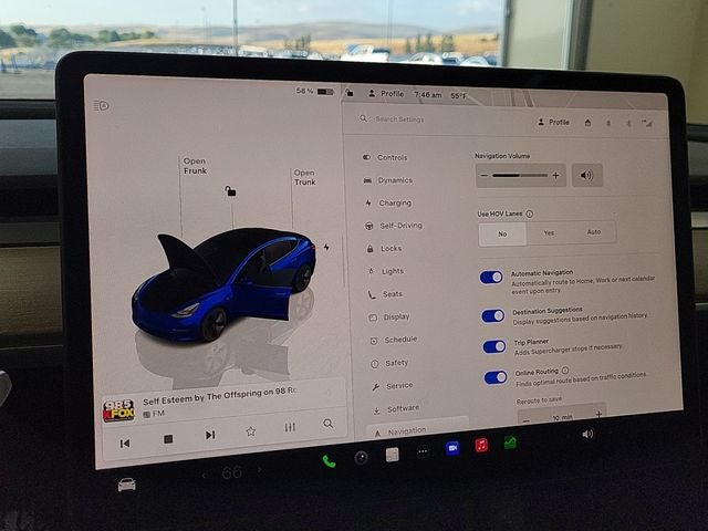 This 2023 Deep Blue Metallic Tesla Model 3 Base RWD is well equipped and includes these features and benefits: 4-Wheel Disc Brakes, 8 Speakers, ABS brakes, Air Conditioning, Alloy wheels, Audio memory, Auto High-beam Headlights, Auto-dimming door mirrors, Auto-dimming Rear-View mirror, Automatic temperature control, Brake assist, Bumpers: body-color, Compass, Delay-off headlights, Driver door bin, Driver vanity mirror, Dual front impact airbags, Dual front side impact airbags, Electronic Stability Control, Emergency communication system, Exterior Parking Camera Rear, Four wheel independent suspension, Front anti-roll bar, Front Bucket Seats, Front Center Armrest, Front dual zone A/C, Front reading lights, Fully automatic headlights, Genuine wood dashboard insert, Heated door mirrors, Heated Front Bucket Seats, Heated front seats, Heated rear seats, Heated steering wheel, HVAC memory, Illuminated entry, Knee airbag, Lane Departure Warning System, Low tire pressure warning, Memory seat, Navigation System, Occupant sensing airbag, Outside temperature display, Overhead airbag, Passenger door bin, Passenger vanity mirror, Power door mirrors, Power driver seat, Power passenger seat, Power steering, Power windows, Premium Seat Trim, Radio data system, Radio: Upgraded Audio System, Rain sensing wipers, Rear reading lights, Rear seat center armrest, Rear window defroster, Security system, Speed control, Speed-sensing steering, Split folding rear seat, Steering wheel memory, Steering wheel mounted A/C controls, Steering wheel mounted audio controls, Telescoping steering wheel, Tilt steering wheel, Traction control, Trip computer, Variably intermittent wipers, and Wheels: 18 x 8.5 Aero.